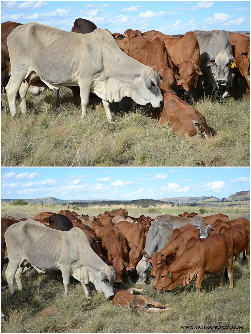 He drove back to get some help and then loaded the calf onto the bakkie and chased the whole herd and their bull, Zed DLV 10-17, closer to home. The calf and its mother were put in a small camp next to our house, but it took a few hours the next morning to get it to stand again. Fortunately this story has a good ending and the calf is now looking much better and drinking greedily from its mother. But it’s scary to think that if Quentin hadn’t driven out to take photos that afternoon it could’ve all ended very differently. Please let us know if anyone else has had similar experiences with Boran calves.