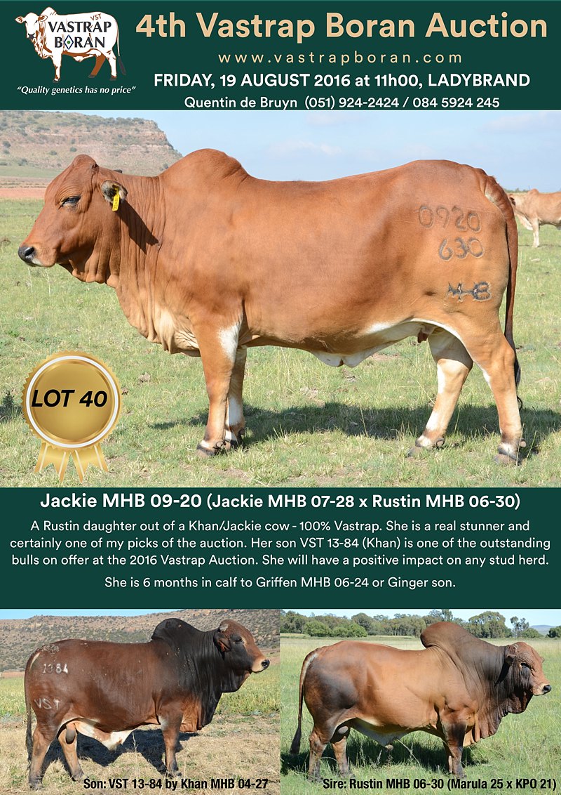 The average price of bulls sold on the day was R39,000. The top priced bull was VST 13-84 (Jackie MHB 09-20 x Khan MHB 04-27), which sold for R160’000 to Burnie Staal from Bos Blanco. This bull is the son of the top priced cow, Jackie MHB 09-20.
