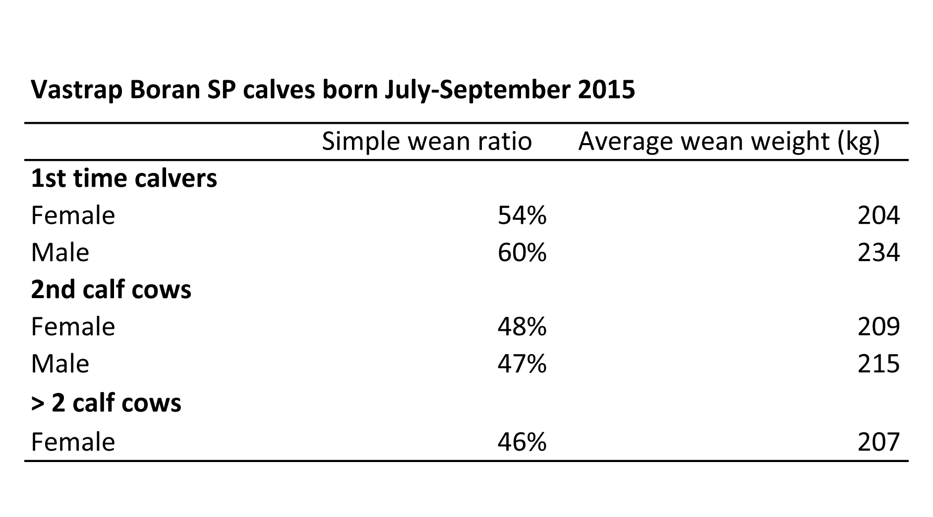 Against this backdrop, we have been absolutely gobsmacked by the resilience of our cattle, particularly the Boran. They have done us proud through these very stressful conditions. We expected our fertility rates to plummet and especially did early pregnancy testing to see which animals we could sell, but the results were astounding. Our overall pregnancy rate is about 85%, which is lower than last year, but many farmers would be very happy with that in a normal year. We were also extremely surprised by the amazing quality of our most recent batch of Boran weaner calves (weaned on 29 March 2016). We would normally be happy with a wean ratio of 50% for bull calves and 45% for female calves, but our ratios were much higher than that for our first group of 2015 Boran weaners (see table). The group of bull calves from first time calving mothers achieved an average wean ratio of 60% and average weight of 234kg, which is really extraordinary in these conditions!