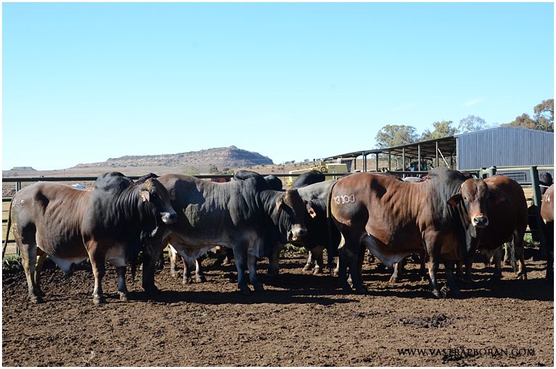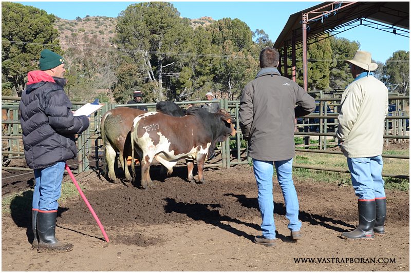 All breeders place slightly different importance on certain attributes and each bull is discussed to reach consensus. The evaluations are based purely on phenotype (not genetics). Structural correctness and meat attributes are used to give bulls a rating of A+ for herd sires, A for stud sires, B+ for top commercial , B for average but passable and C for cull.  It is quite important to note that these bulls are all fully registered SP Boran bulls, having passed inspection by the Boran Society of South Africa. They have also been selected against each other based on their performance in a phase-D veld performance test (see Bull selection and Performance testing).  Of the original 70, that started the year, 43 were left over for this physical inspection by the independent breeders. Typically there are about 5 bulls that get an A+ rating, 15-20 that get a A- or A rating, 15-20 that get a B+ rating and about 10 that are B or C.  The B’s and C’s are all culled even though they performed well in the veld test, have been passed by the Boran Society, but are not deemed worthy of the Vastrap Boran brand and will not be good ambassadors for the Boran breed.