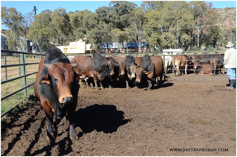 Every year as part of our efforts to ensure that only the best 3-year old bulls are offered at the annual Vastrap Boran Auction, some independent fellow Boran breeders help us to do a visual evaluation of our bulls. It was one of the coldest mornings of the year, but seeing how far the bulls have come made it all worthwhile. We had two visitors from Botswana watching the proceedings and we made sure they were bundled up in warm jackets and beanies!