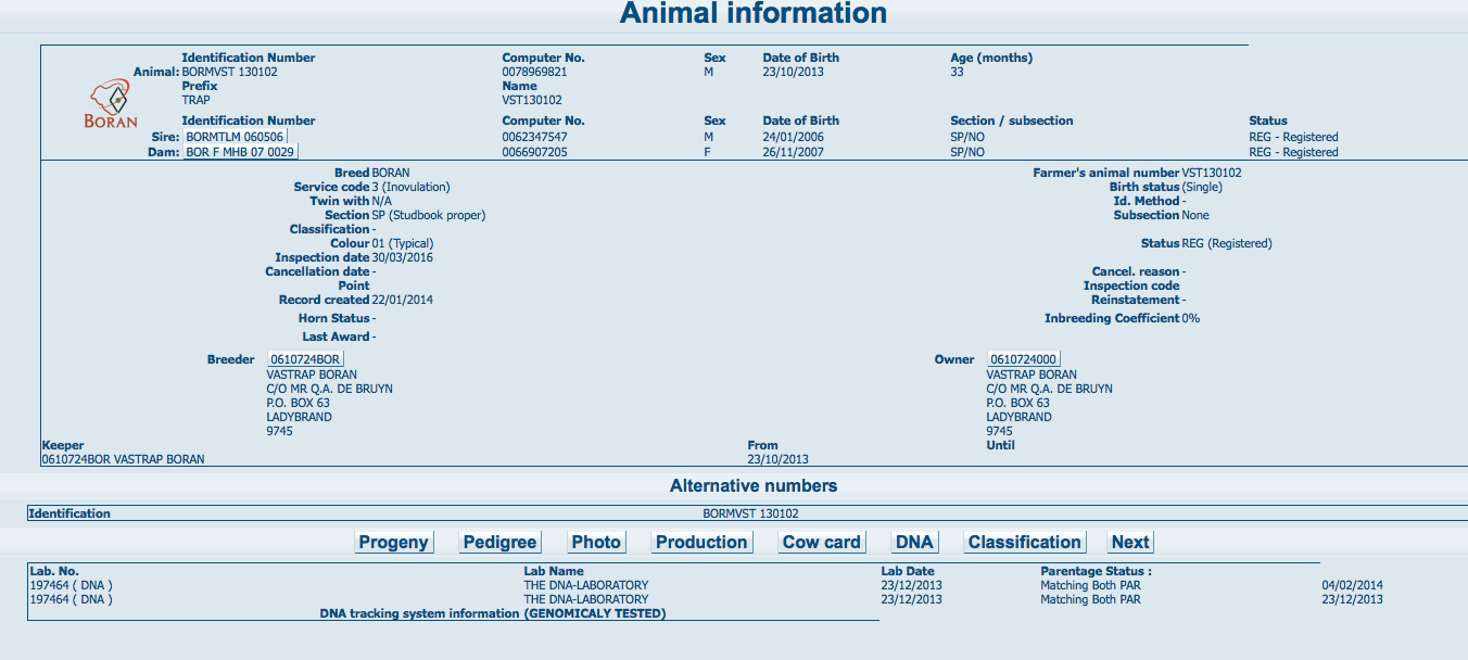 Below is an example of one of the 20 three year old Boran bulls that will be sold at the 2016 Vastrap Auction, VST 13-102. This bull’s DNA animal information page on Logix, shows that his DNA and parentage have been verified. We can assure you that this is the case with all the animals we sell as is clearly printed in our Vastrap Auction checklist. The 4th Vastrap Auction will be held on Friday, 19 August @ 11h00.