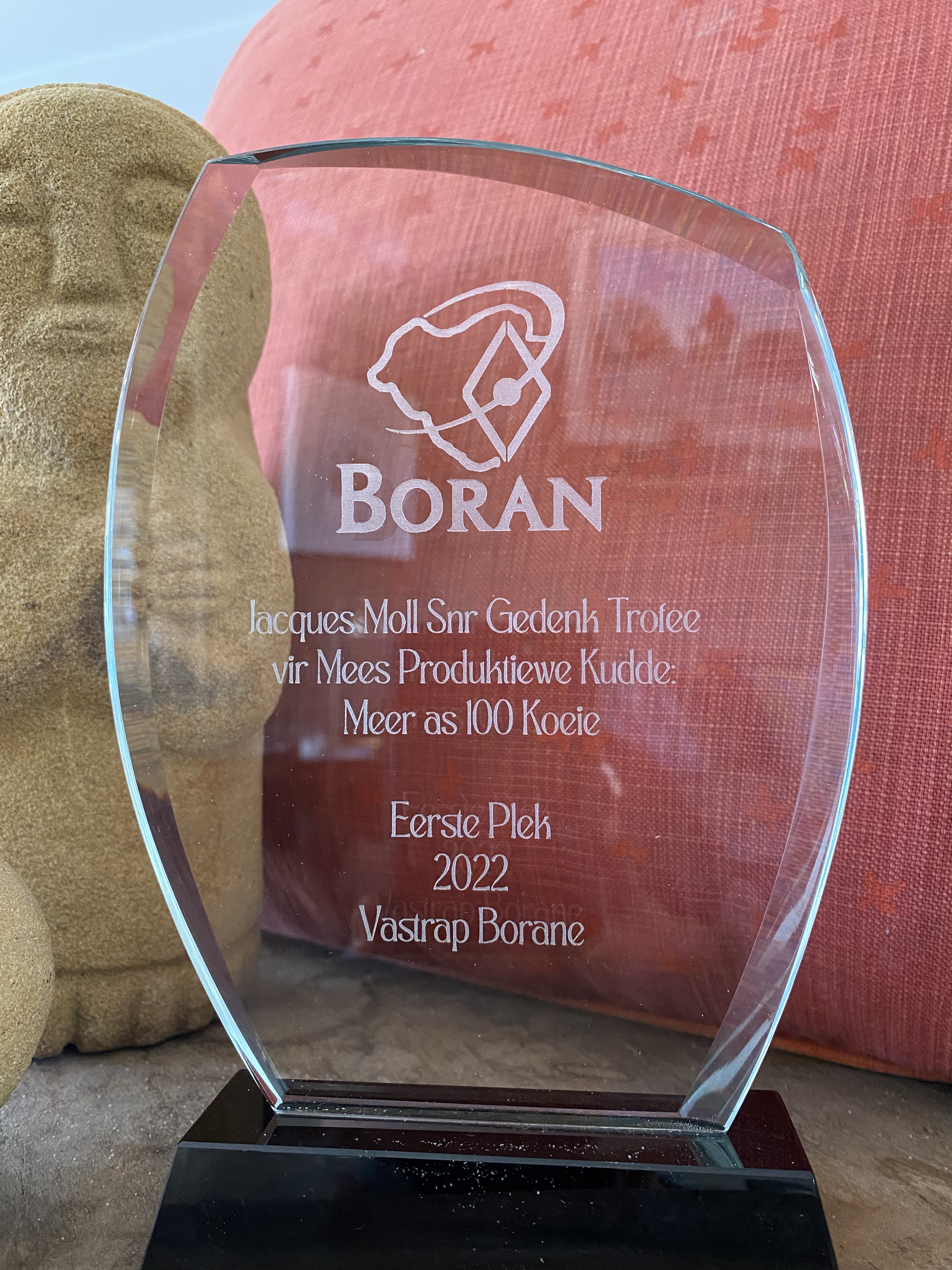 Vastrap Boran was awarded the Jacques Moll Snr Trophy for being the most productive large Boran herd in South Africa in 2022. The Boran cattle industry has shown tremendous growth in recent years with a big increase in the quantity and quality of stud Boran in South Africa. In this increasingly competitive environment it is a huge honour for the Vastrap herd to be recognised as one of the best!