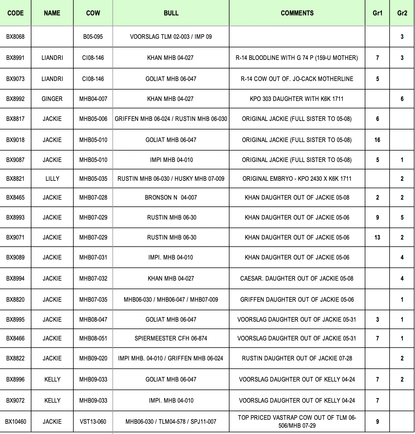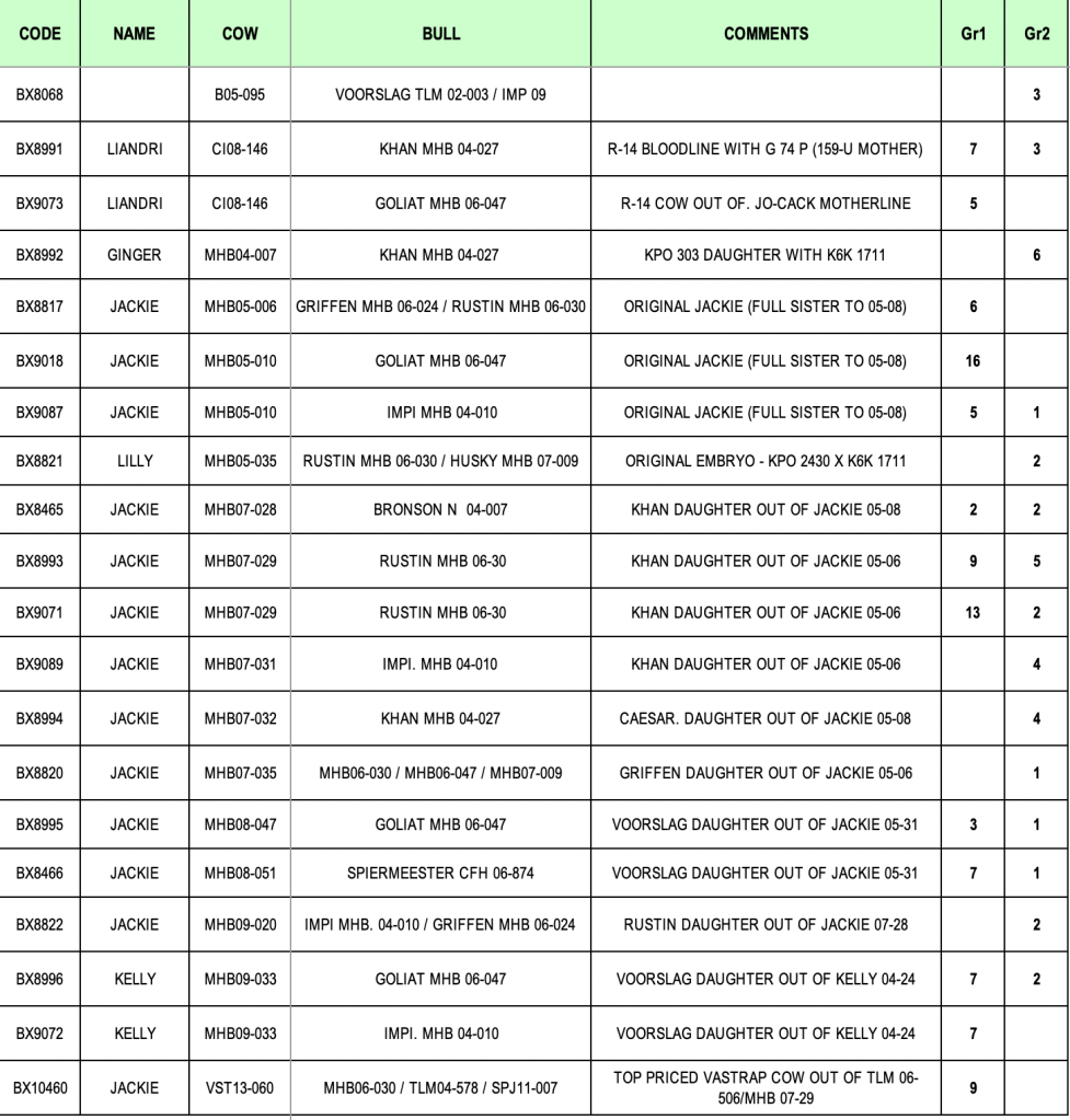 Below is the list of available embryos for sale as of May 2022. Please contact us for prices.
