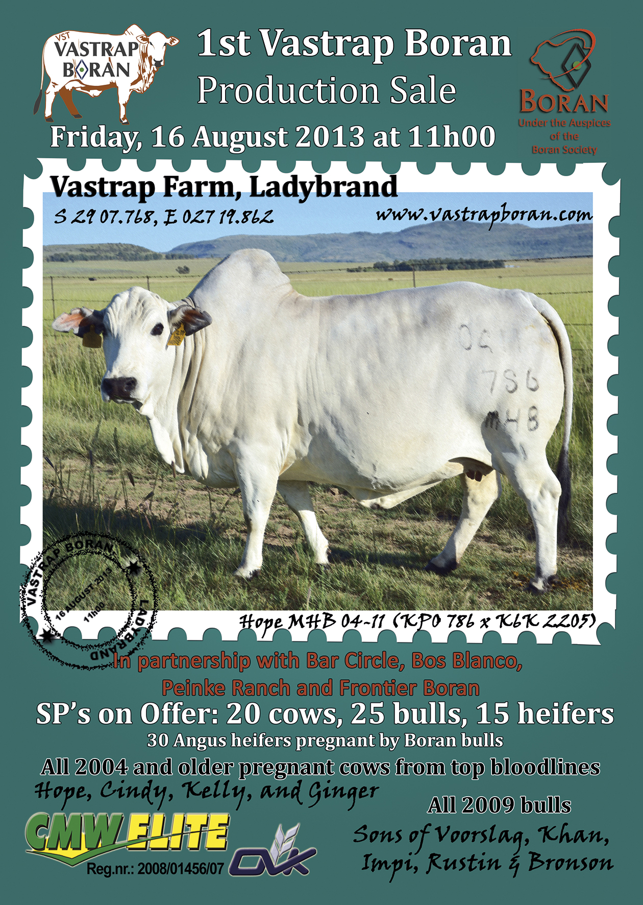 The inaugural Vastrap Boran auction will take place on 16 August 2013 at Vastrap Farm near Ladybrand in the Eastern Free State. We are introducing a new sale concept, which will guarantee that we consistently deliver top quality animals to the market in an open and transparent manner. This year Vastrap Boran will be selling all of our registered and pregnant 2004 and older females (no exceptions) and all of our 4 year old bulls. This includes some of the most famous Mollshoop cows such as Hope MHB 04-11 (see The Hope bloodline), Kelly MHB 04-24 (see The Kelly bloodline), Cindy MHB 04-06 and her full sister 04-04 (see The Cindy bloodline). There are also some very rare genetics such as a FE 93-66 daughter and grand-daughter. By placing all of our pregnant 2004 and older cows on auction you can be guaranteed that we are not being selective.
