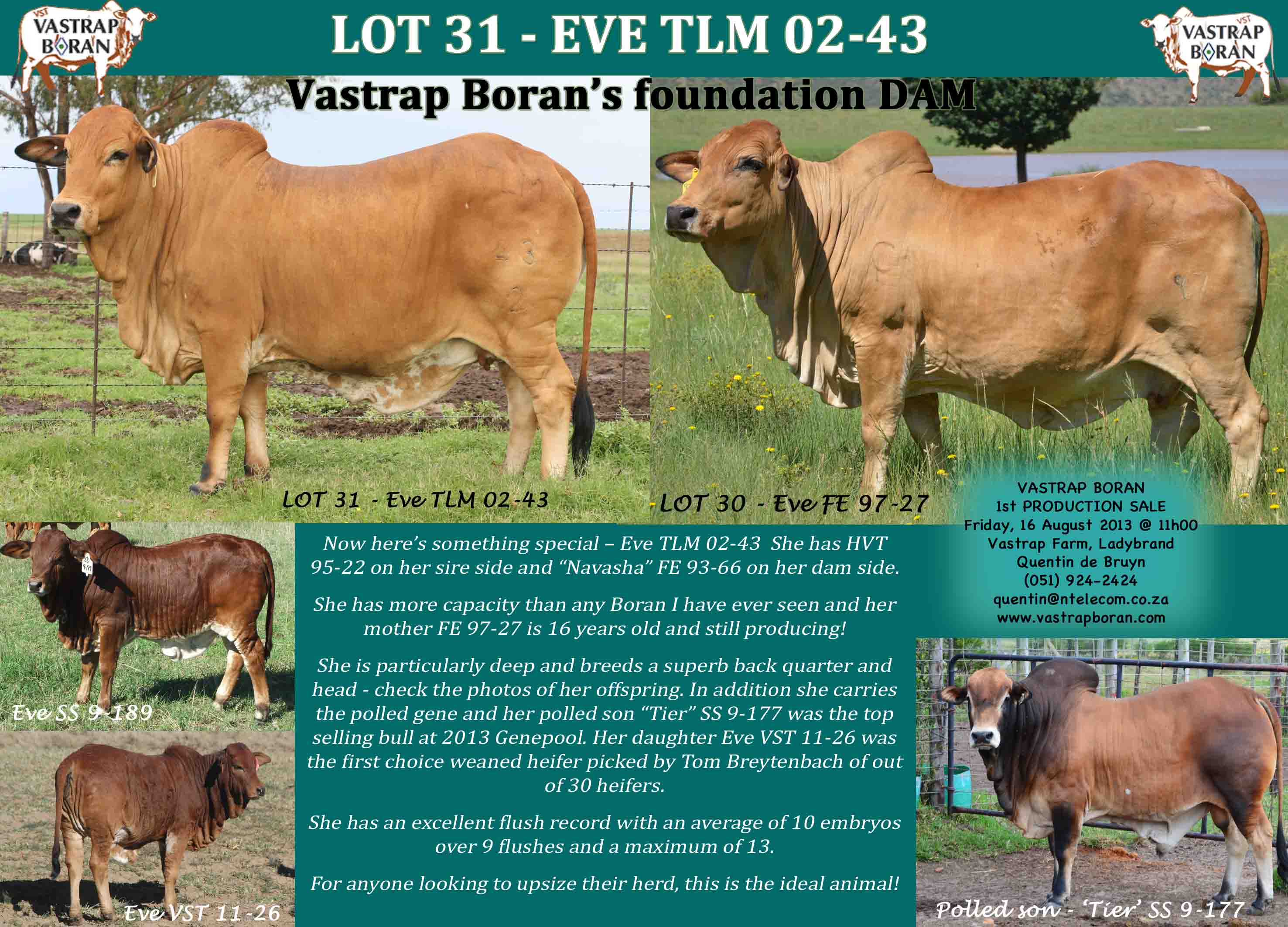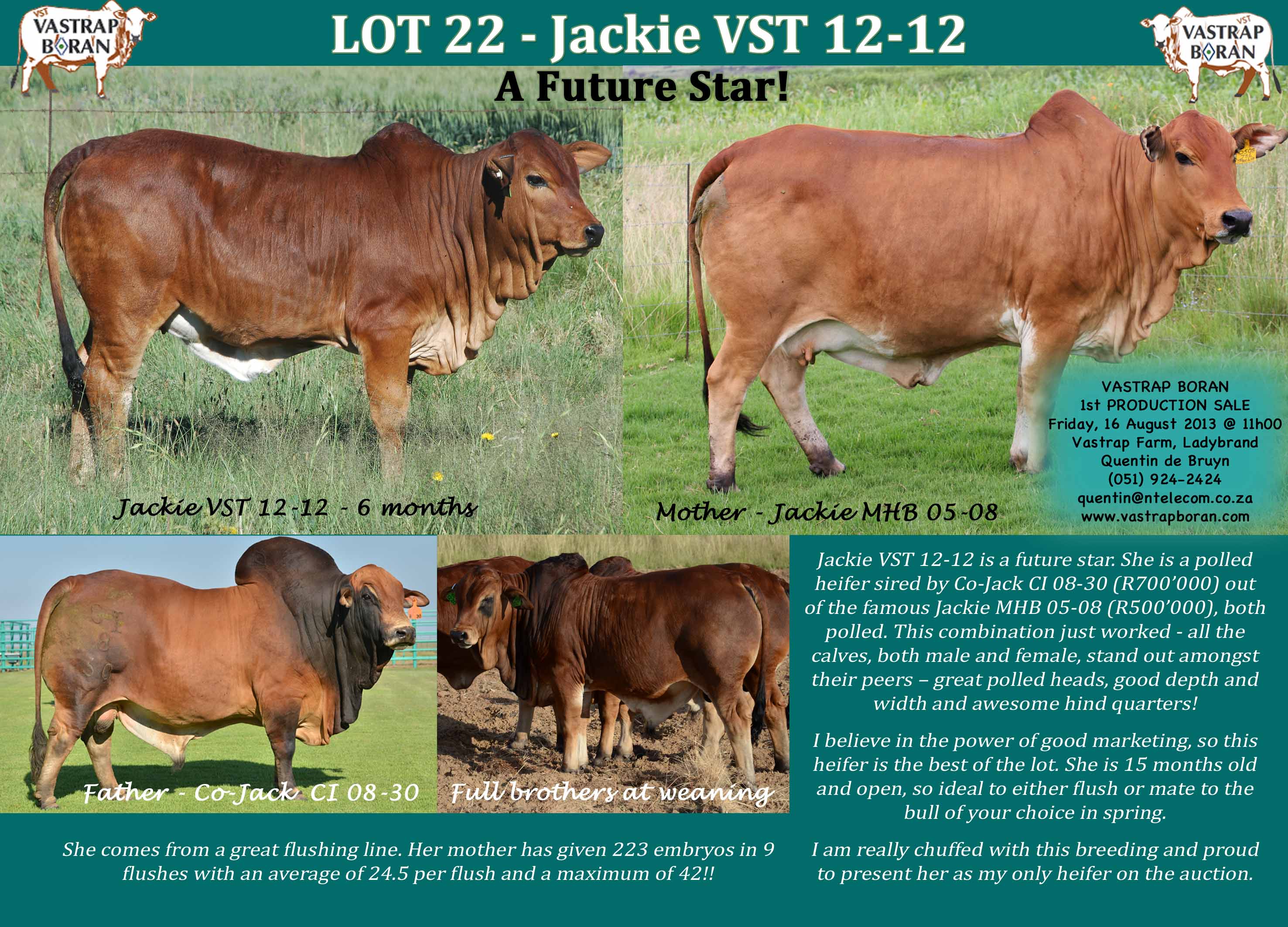 Thank you to everyone who made such a big effort to join us at the inaugural Vastrap Boran auction! We really appreciate your support and hope that you enjoyed the day with us. We look forward to hosting you again next year! Below are some of the top prices received for our SP cows. Thank you very much to the buyers for their support. We have no doubt that these beautiful animals will add value to your respective herds!