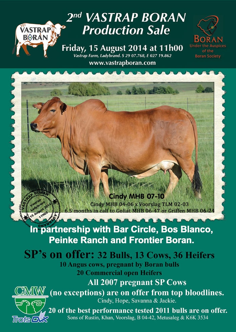 The 2nd Vastrap Boran auction will take place on Friday, 15 August 2014 at Vastrap Farm near Ladybrand in the Eastern Free State. Our inaugural auction last year was extremely well supported and we take pride in the fact that 100% of the animals offered were sold.