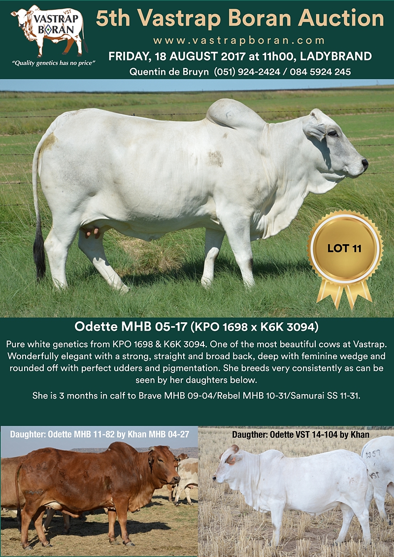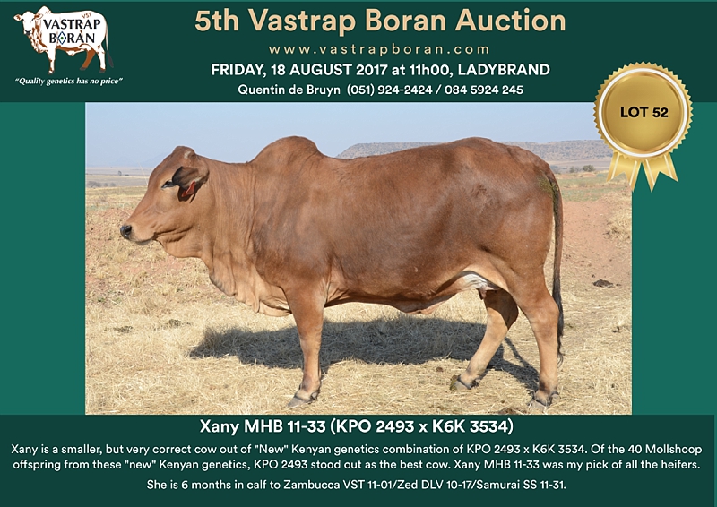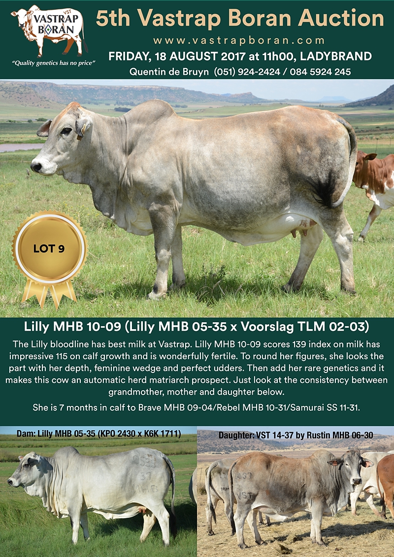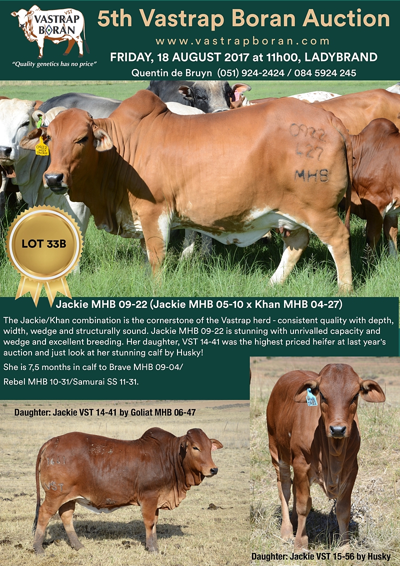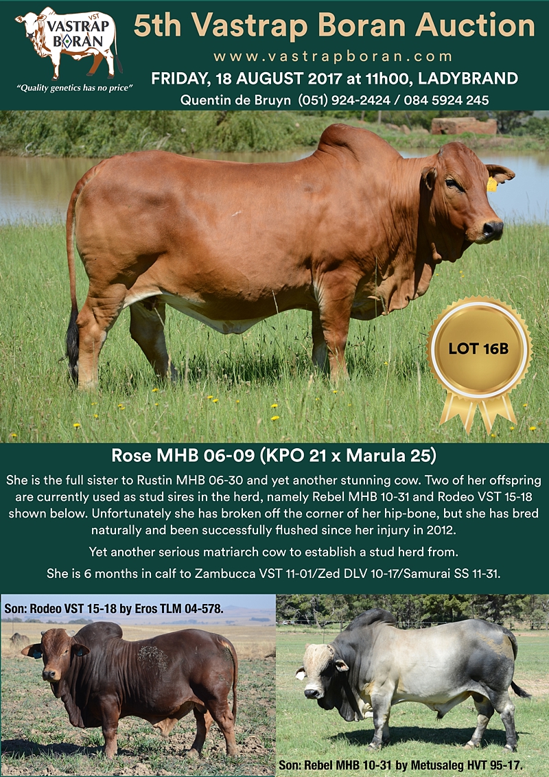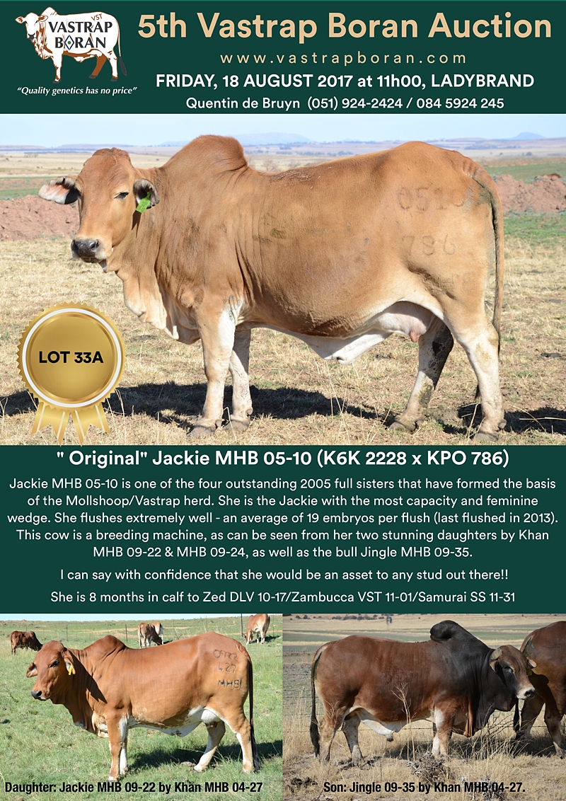 As part of a special offering for the 2017 Vastrap Auction, we will be selling every remaining pregnant Mollshoop Boran (MHB) cow. This includes superstars like Jackie MHB 05-06, Odette MHB 05-17, Rose MHB 06-03, Rose MHB 06-09 and 23 others from the original Mollshoop herd!