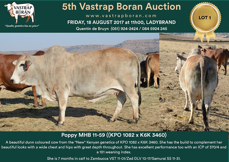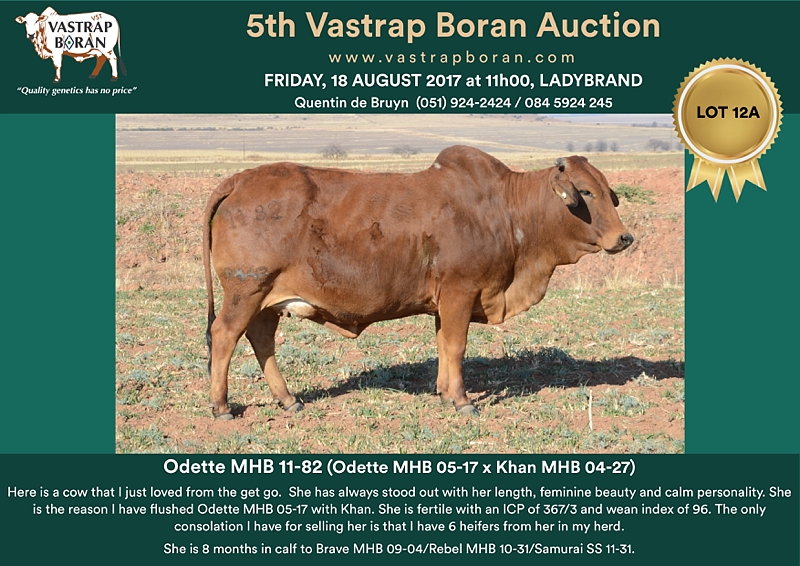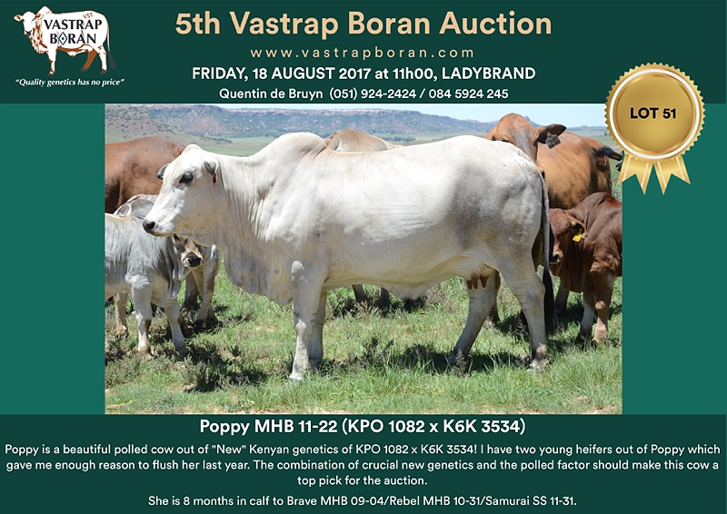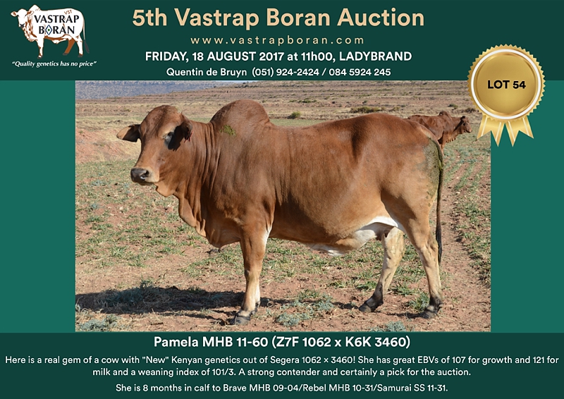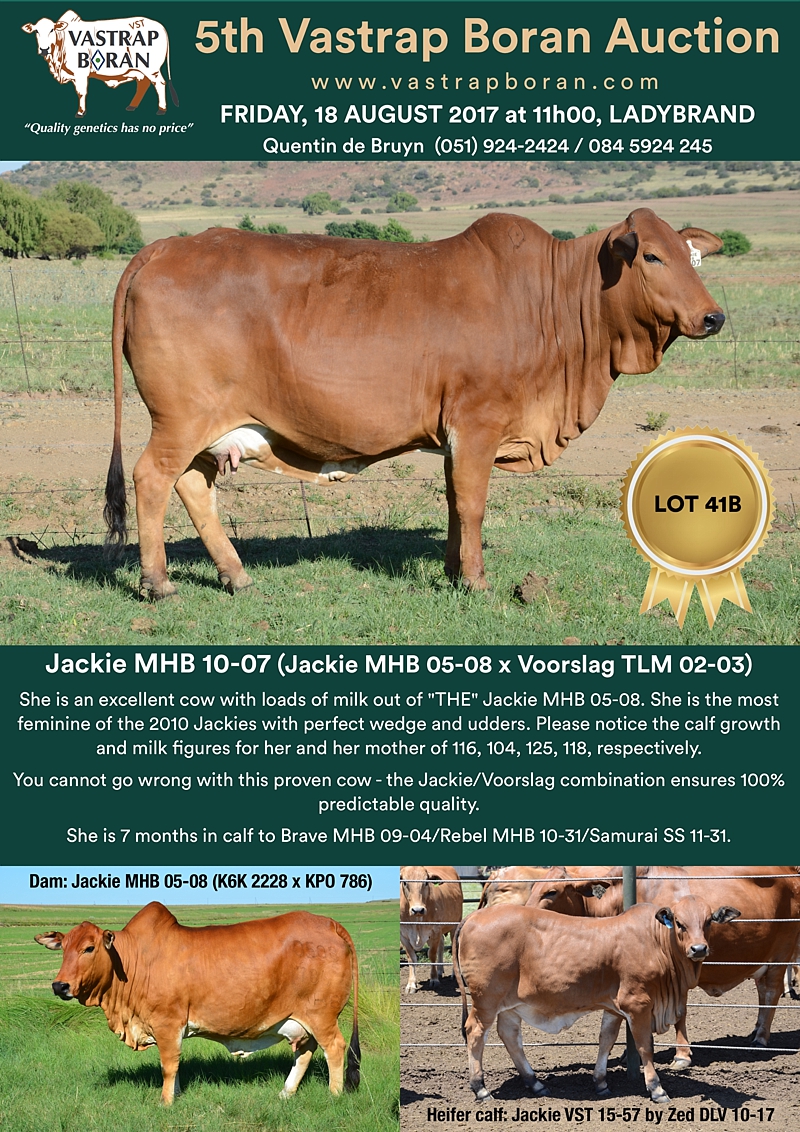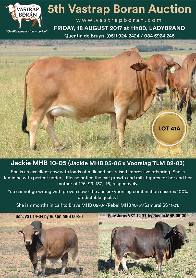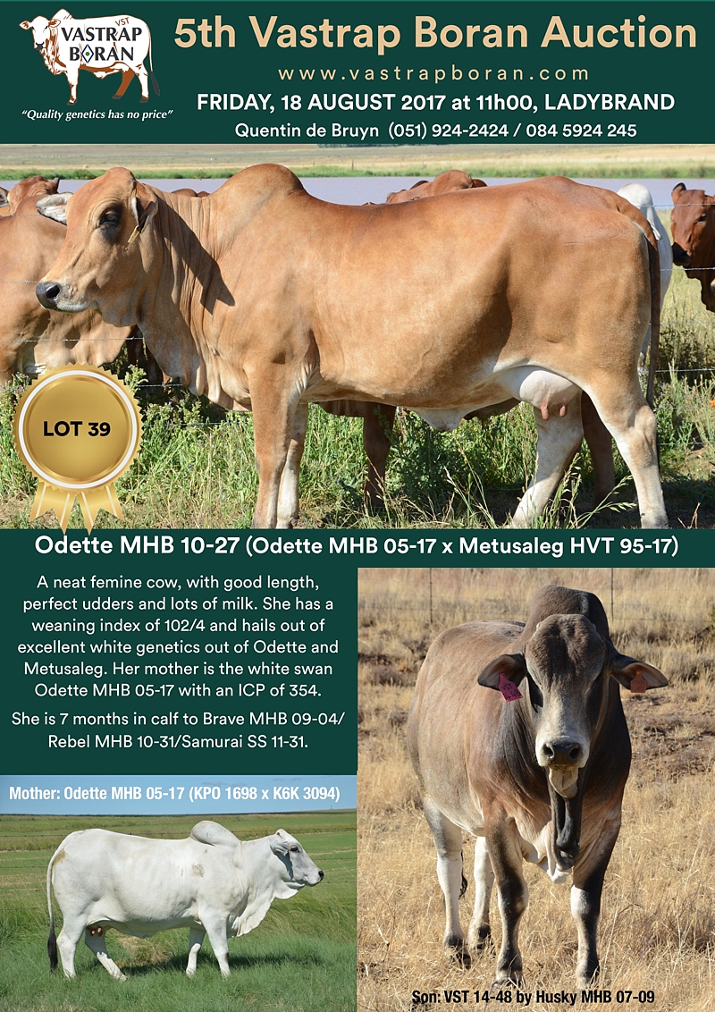As part of a special offering for the 2017 Vastrap Auction, we will be selling every remaining pregnant Mollshoop Boran (MHB) cow. This includes superstars like Jackie MHB 05-06, Odette MHB 05-17, Rose MHB 06-03, Rose MHB 06-09 and 23 others from the original Mollshoop herd!