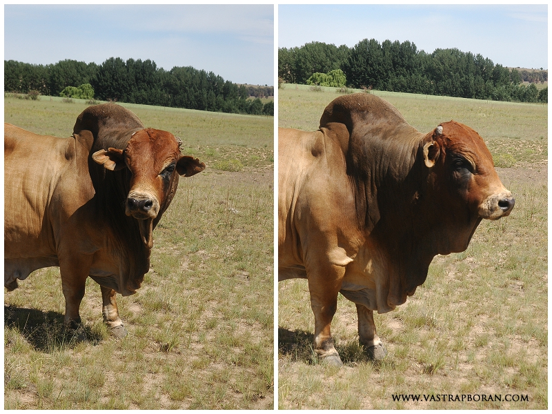 Impi’s outstanding qualities are a strong and masculine head and neck, and extraordinary muscling on his forequarter. Unfortunately he picked up an injury in his right hind hock some time before Vastrap Boran purchased the Mollshoop herd. This has resulted in a wasting away of his hind quarter and has rendered him incapable of natural mating. Unfortunately, the photos we have of Impi do not do him justice. Impi has a heavy sheath and needs to be paired accordingly.